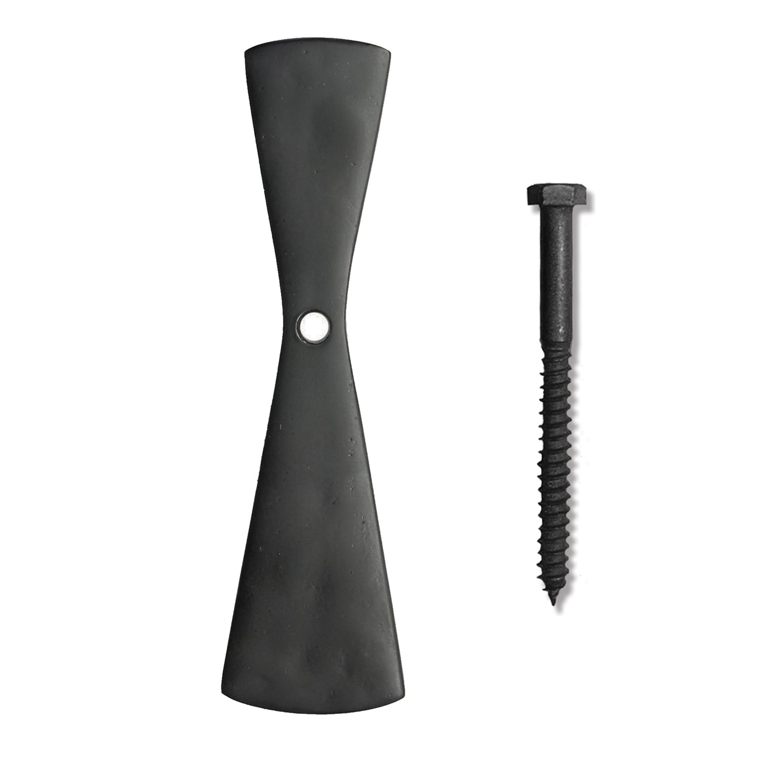A solid-cast Brass Shutter Dog - Propeller style for shutters and windows. Used to tieback/hold the shutter in the fully open position by sitting in front of the shutter. Easily tilt the shutter dog to release. Comes with 4-1/2" Lag by default. Fully stocked in Black Powder Coat only. Color matching stainless steel fasteners included. Other finishes and textures available by custom order.
